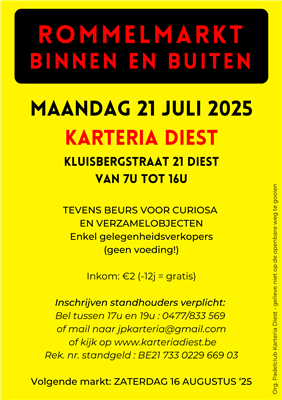 Rommelmarkt Cd-, platen en boekenbeurs Openluchtrommelmarkt 2de hands speelgoed en baby beurs Garageverkopen en rommelmarkt 2de hands kledingbeurs Braderij Straatrommelmarkt