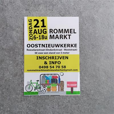 Gezellige rommelmarkt met aanwezigheid van bar en verkoop van braadworsten door organisatie.