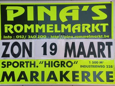 PINA'S ROMMELMARKT terug in de SPORTHAL " HIGRO " 1500m² !!! Industrieweg 228 BAAN GENT-EEKLO. Jaarlijkse gekende massale volkstrekker van formaat. Standhouders! Massale belangstelling verzekerd!! Standplaatsen 4,50 euro/lm in 't midden of 5,50 euro/lm Muurstand (Steeds 2 m Diep) MASSALE PUBLICITEIT VERZEKERD !!! Wegens de grote belangstelling, vervroegd Opstellen zaterdag vanaf 18u00 tot 20u00 of zondag vanaf 07u00. Inkom 2,50 euro of 2,00 euro met kortingsbon van vorige Pina's Rommelmarkten o.a. van zondag 19 febr. Hamme Sporthal GO ! 1500m² Loystraat 70 of van Zondag 5 Maart Sporthal "BATEAS" 1500m² Dendermondsestwg 397, Sint-Amandsberg.