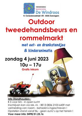 Outdoor tweedehandsbeurs en rommelmarkt met eet- en drankstandjes en kinderanimatie.