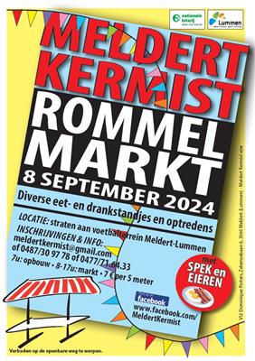 Openluchtrommelmarkt rondom de terreinen SK Meldert met randanimatie zoals : Kermis , spek en eieren , optredens , eierwerpen , ...