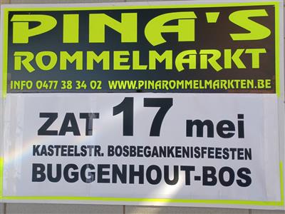 PINA'S 1ste OPENLUCHTROMMELMARKT tijdens de Jaarlijkse Bosbegankenisfeesten in Buggenhout-Bos, een Jaarlijkse Massa-evenement van formaat, dit jaar zijn wij fier, om ook ons steentje er toe bij te dragen. Een Middeleeuwse traditie i.v.m. de Boskapel, deze is het bezoeken waard, en dat zou men zeker toch eens 1 keer in mijn leven bezocht moeten hebben, is Gratis en bovendien kan men genieten van het Bos zelf. De Openluchtrommelmarkt start in de Kasteelstraat tussen 2 enorme parkings die Gratis zijn vanaf 9u00 tot 18u00. Standplaatsen te bestellen per 5 m, dus 5, 10, . . . Auto en/of Aanhangwagen bij de standplaats geen probleem. 0477/38.34.02 MASSALE PUBLICITEIT VERZEKERD !!! Massale Belangstelling verzekerd !! Vooraf Reserveren Verplicht !! ( + steeds € 5,00 waarborg te betalen, Waarborg terug na het opruimen op het einde van de Rommelmarkt ). B