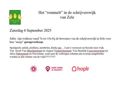 Jullie zijn welkom vanaf 7u tot 15u bij de bewoners van de schrijverswijk in Zele voor hun “mega” garageverkoop.